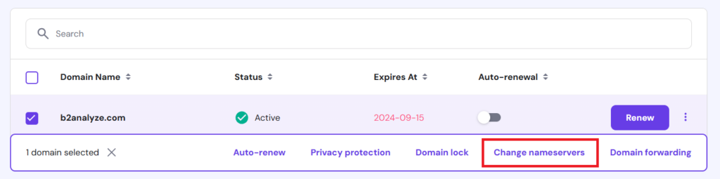 Now that everything is set up in Cloud86, the next step is update the nameservers in Hostinger. Navigate to their website and log in with your account. Go to “Domains” and click on “Domain Portfolio”. Select your domain name and click on “Change Nameservers”