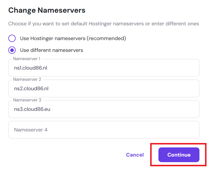 Choose “Use Different Nameservers,” then copy and paste the nameservers of Cloud86.
